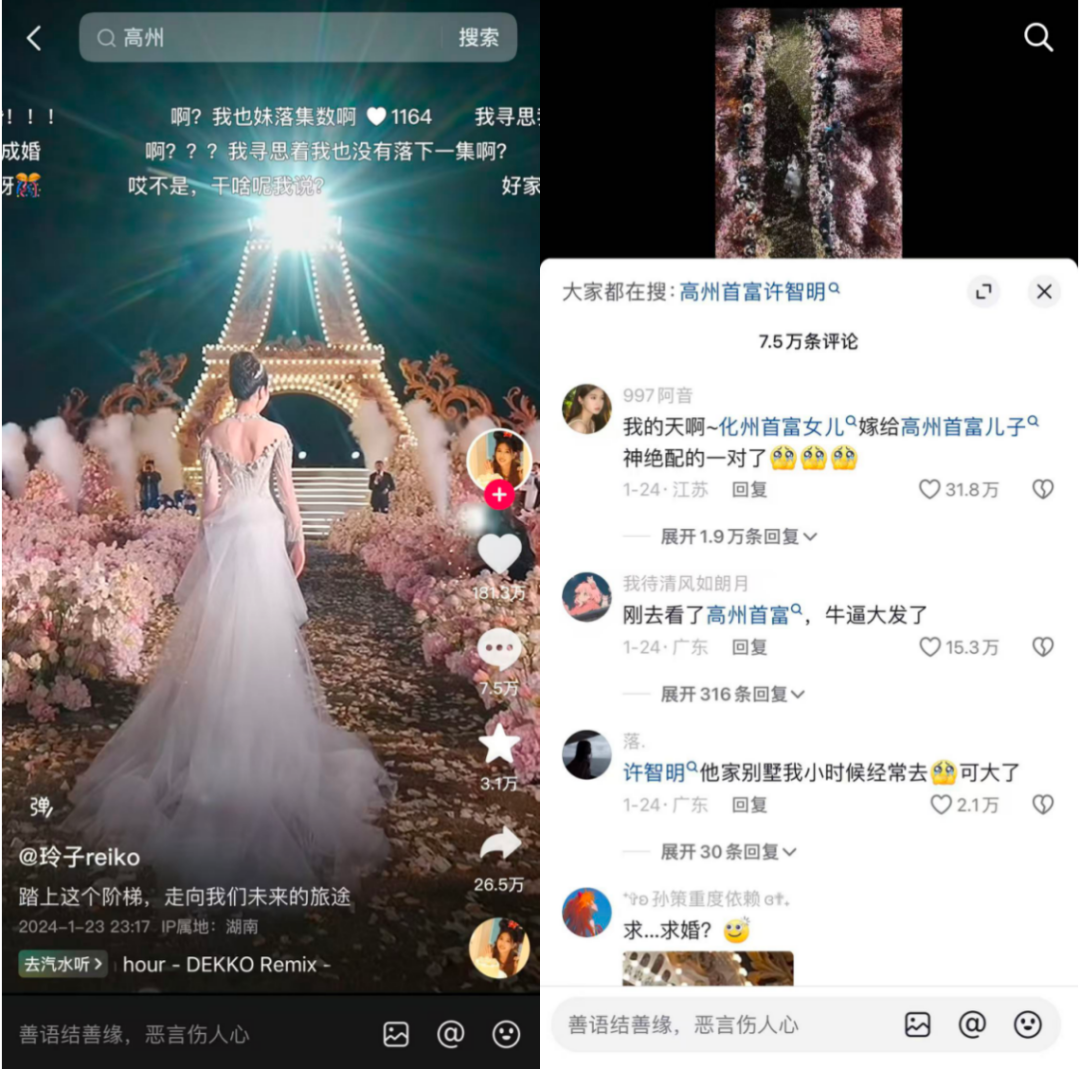 今年,玲子被求婚的消息传出,全真花布景、鸽子蛋一样的钻戒、对象是高州首富之子、订婚开销七百多万……没有什么比这样一场预算拉满的订婚现场更有说服力,这位豪门网红上了一个又一个热搜,真正在大众层面刷出了存在感。