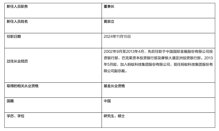 11月15日,天弘基金管理有限公司发布关于董事长变更的公告。韩歆毅因工作原因离任,黄辰立新任董事长。2002年9月至2013年4月,黄辰立先后任职于中国国际金融股份有限公司投资银行部,巴克莱资本投资银行部及摩根大通亚洲投资银行部。2013年5月起,加入蚂蚁科技集团股份有限公司,现任蚂蚁科技集团股份有限公司副总裁。