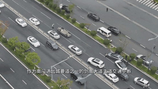 此时,三条车道被事故车辆占了两个半车道,交通已经中断,作为进出城主干道之一的剑南大道向来车流量巨大,一旦出现交通异常,拥堵将很快“辐射”到周边区域。拖车已经待命,但如果等待吊车前来吊正车辆,也许会等待较长时间。此刻,成都交警六分局立即启动应急机制,周边路口警力也迅速作出响应,协力保障剑南大道道路交通安全畅通。