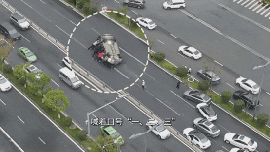 11月13日下午,在成都高新区剑南大道发生一起三车事故,其中一辆仰翻在道路中间。接到警情的成都交警六分局巡逻交警到达现场后,振臂一呼,路过的、围观的十多名市民毫不犹豫小跑到了仰翻车辆前面,众人齐喊口号、齐心协力,仅用十余秒就把四轮朝天的汽车“掀”正,又一起将其推到拖车面前。经过市民与交警的共同努力,在不到8分钟的时间里,就让交通秩序恢复正常,为大家点赞!