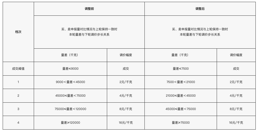 4、第三档量差范围由原75000-120000千克调整为45000-75000千克,调价幅度对应8元/千克;