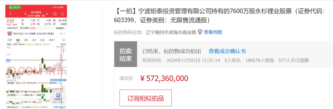 12天前,宁波炬泰持有的永杉锂业股份被法拍,福建民企永荣集团有限公司(简称“永荣集团”) 通过旗下公司永荣致胜“举牌”永杉锂业,在经过189次和210次的竞价争夺后,分别以69.23%和99.14%的高溢价率拿下该公司两笔被拍卖股份,合计竞买1.02亿股,成交金额约8.04亿元,所拍卖股份占永杉锂业总股份比例约19.79%