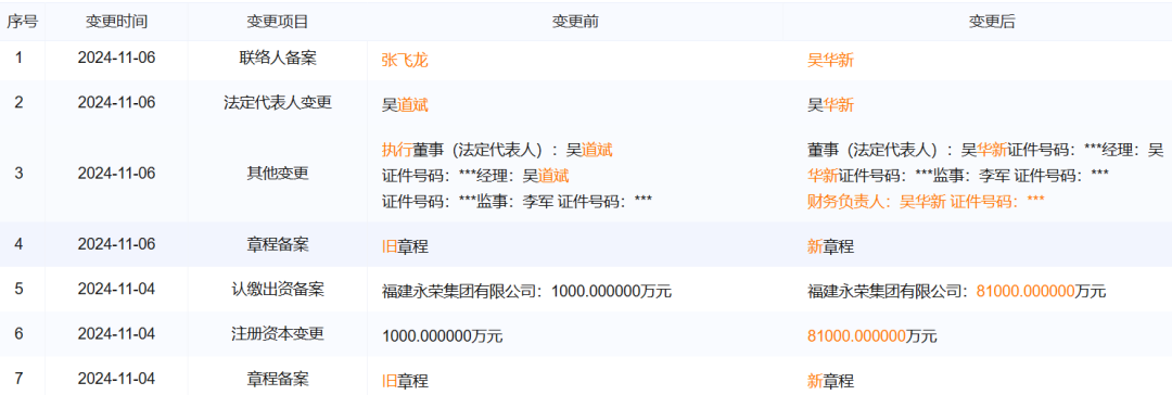 此外,永荣致胜的法人、董事、联络人也都改为永荣集团董事长吴华新。