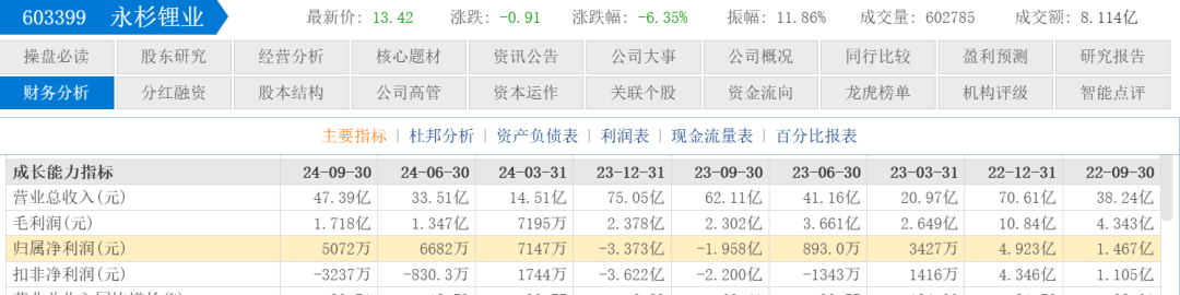 2024年前3季度,由于锂盐价格持续大幅下跌,永杉锂业营收47.39亿元,同比有所减少,但在营收下降的同时却实现净利润5072万元,同比增长125.9%,成为十大锂业上市公司少有的实现盈利的公司之一。