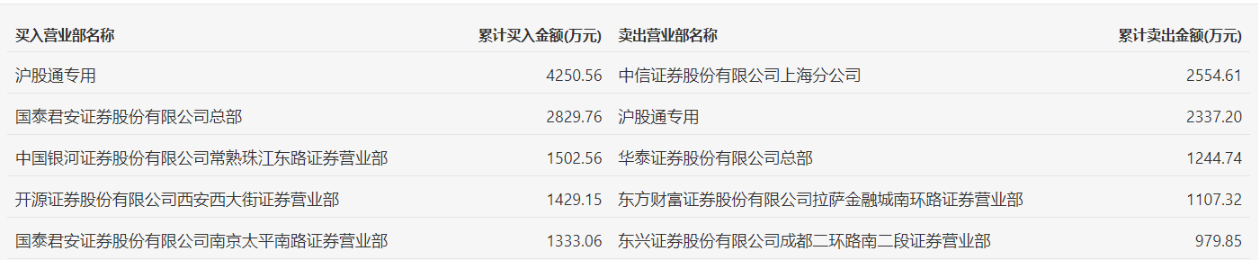 具体来看,知名游资现身龙虎榜,作手新一(国泰君安证券股份有限公司南京太平南路证券营业部)净买入1333.06万元。此外,沪股通专用、国泰君安证券总部分别买入4250.56万元、2829.76万元;中信证券上海分公司、沪股通专用分别卖出2554.61万元、2337.20万元。
