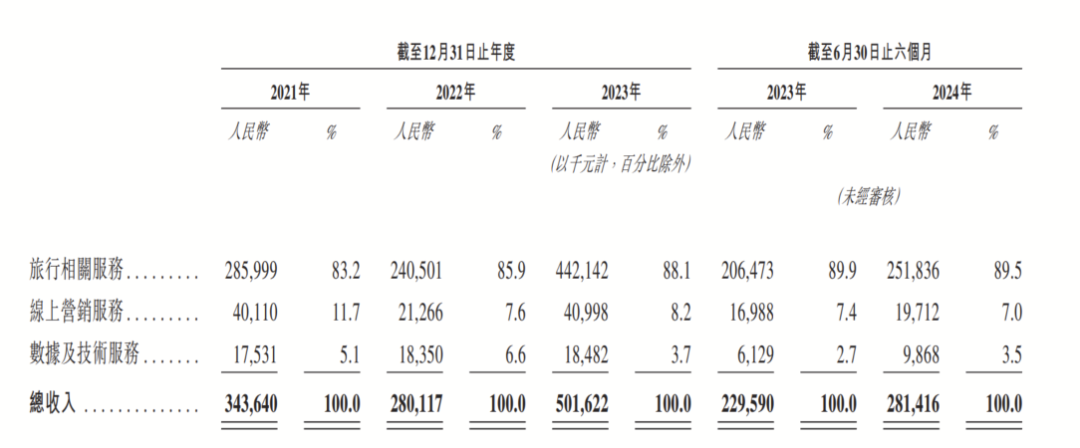 具体看,旅行相关服务带来的收入从2021年的2.86亿元增长至2023年的4.42亿元,占营收的比例从83.2%上升至88.1%。2024年上半年,营收达2.52亿元,占比89.5%。