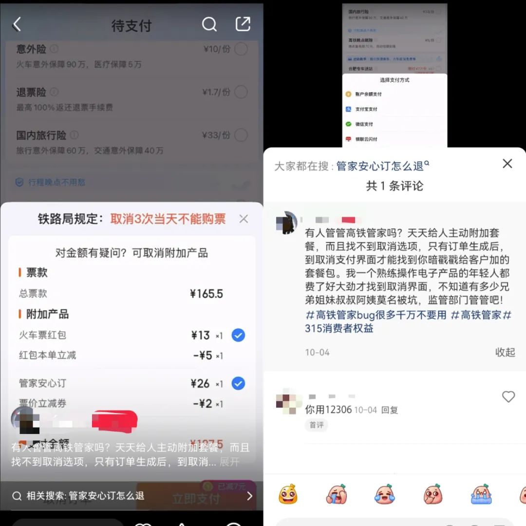 在小红书上,关于高铁管家APP的吐槽贴层出不穷。有用户反映,购票时“管家安心订”“火车票红包”默认勾选,收费26元和13元,这些选项往往隐藏较深,取消难度不小。有用户直言,即便自己很熟悉电子设备,也需要费好大劲才能找到取消的选项。