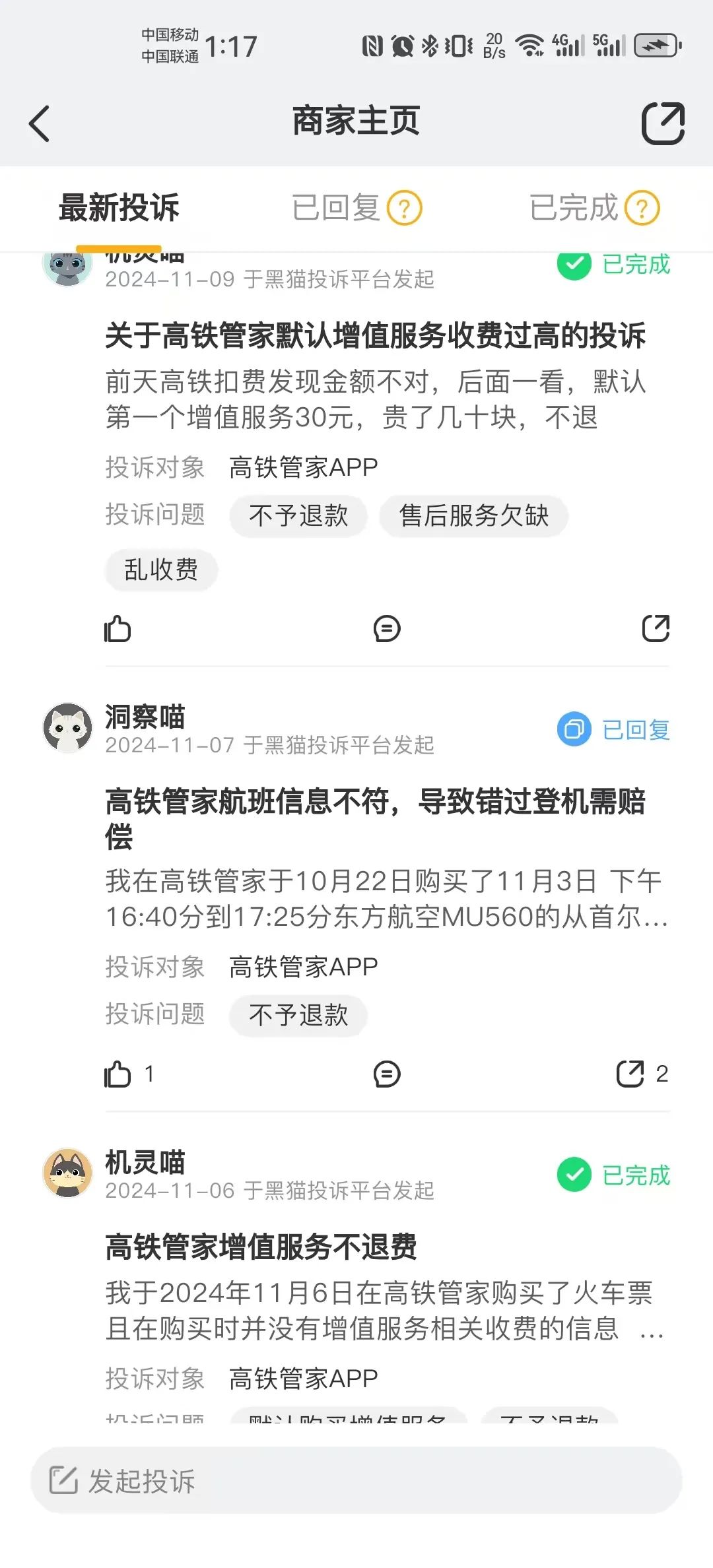 在黑猫投诉平台上,高铁管家APP的投诉数已达5529条,涉及增值服务收费过高、增值服务不退费、要求退还手续费、乱收费等问题;航班管家APP则有177条投诉,涉及强制附加服务和机票退款。