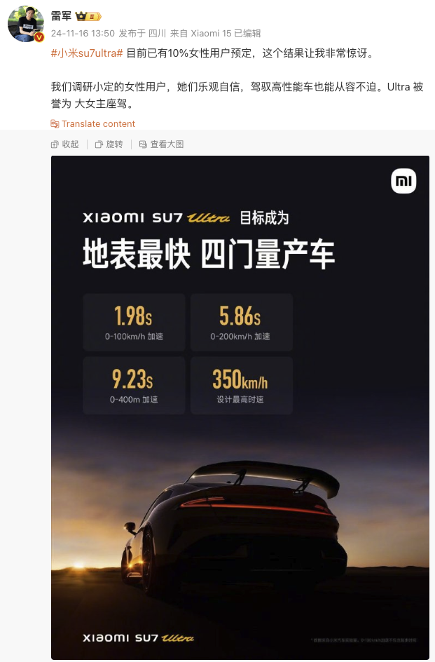 11月16日,小米集团董事长兼CEO雷军在微博发文透露,小米SU7 Ultra目前已有10%女性用户预定。据了解,该车型预售价81.49万元,将于2025年3月正式发布。