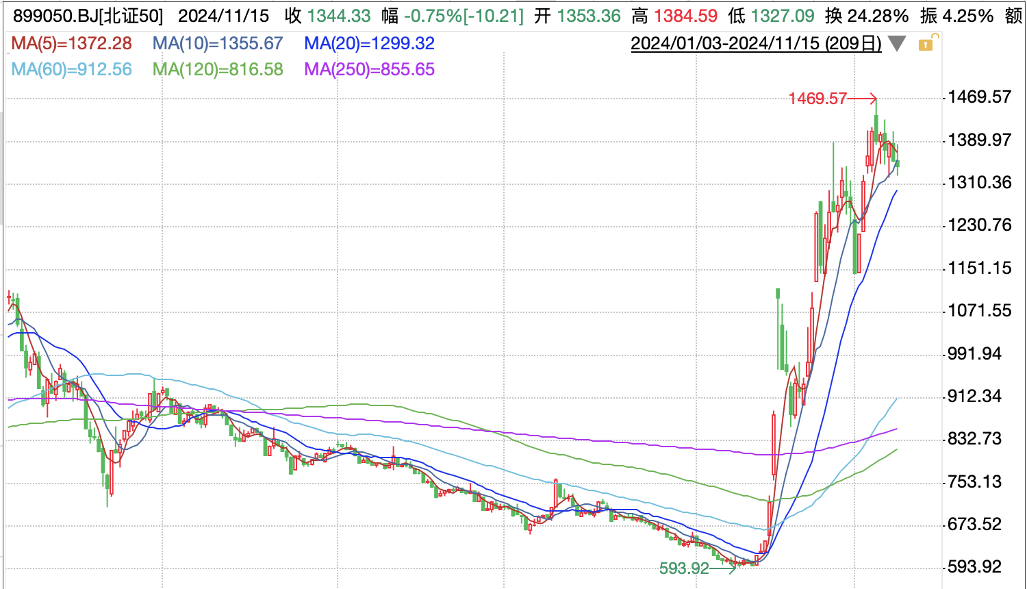 2022年11月21日,北证50成份指数作为北交所首只宽基指数,正式上线实时行情。而在今年9月末至今的本轮行情中,北证50成了A股最“亮眼”的存在。从9月23日收盘至11月15日收盘,北证50从599.76点上涨到1344.33点,区间涨幅达到惊人的124.14%。