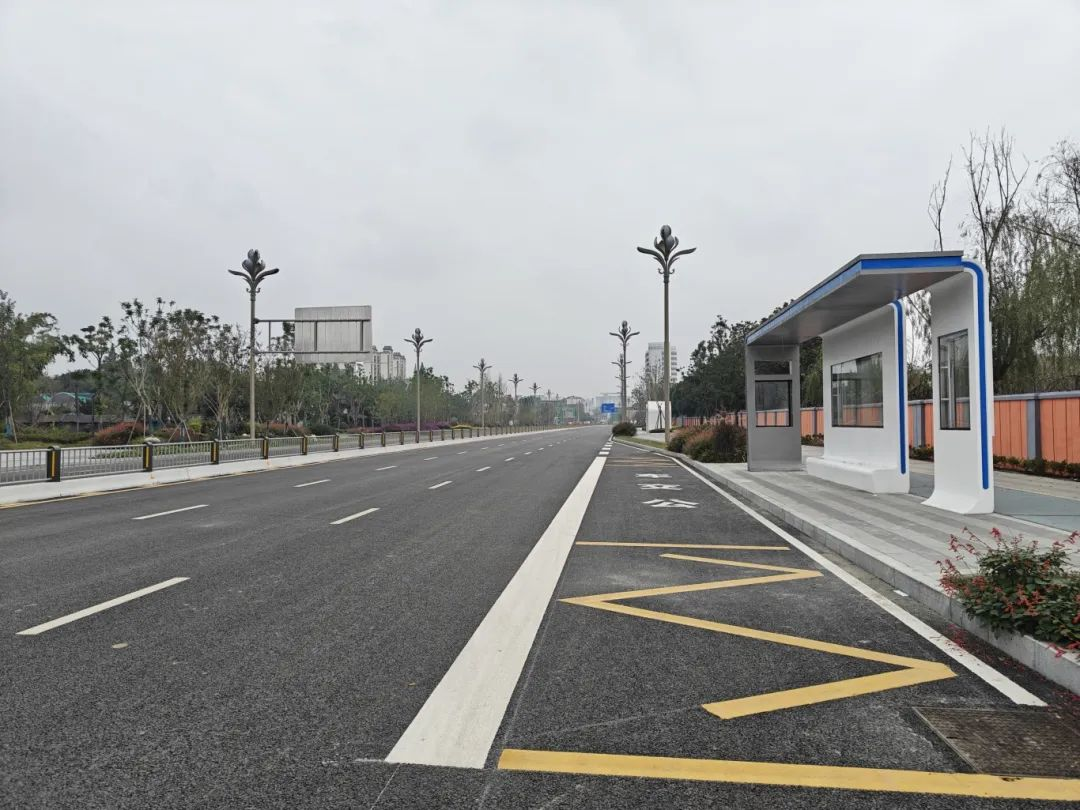 从蔬香大道经环城大道进入飞星路,由西向东可以看到,双向六车道笔直平整,依次与濛阳大道、天府大道北延线交汇联通,自2021年项目开建以来,在市陆港办、濛阳街道、彭州发展等职能部门的通力协作下,经过多方努力,项目顺利推进,目前道路主线、绿化植被、公交站台、路灯路牌已经全部施工完毕,正在进行各交汇路口信号灯测试工作。