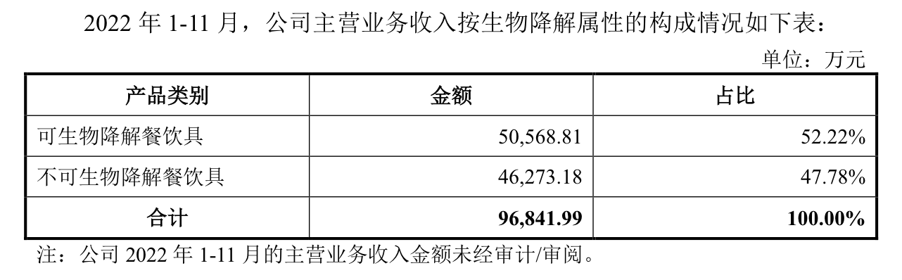 值得注意的是,恒鑫生活的产品中,可生物降解餐饮具与不可生物降解餐饮具的收入占比相差不大。2022年1-11月,两者收入金额分别为5.06亿元和4.63亿元,占比分别为52.22%和47.78%。截至2022年11月,公司在手订单可生物降解餐饮具1.15亿元占比55.47%,不可生物降解餐饮具9200.28万元占比44.53%。而这也令市场有所担忧。
