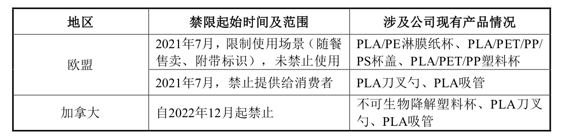 除此外,公司境外销售主要地区包括大洋洲、北美洲及欧洲,其中欧洲(主要是欧盟)、加拿大禁限塑政策较严、覆盖其内部区域较广。