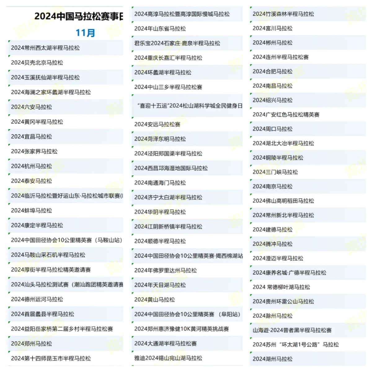 从11月份的马拉松赛事的日程安排上,我们可以看到,在一二线城市举行的马拉松赛事不算太多,反而像常州、黄冈、康定、蚌埠、临沂、顺德、滁州、湖州等地方举行的马拉松较多。据不完全统计,这一个月内,有上百场马拉松赛事。