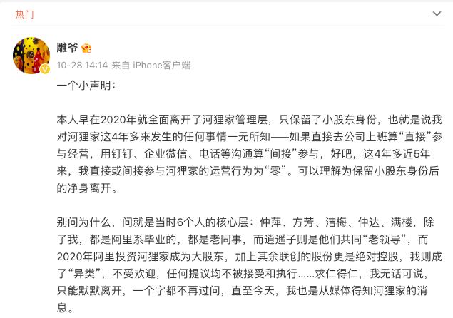 以“解放天下手艺人”为愿景,提供美甲、美容、美发等上门服务为主的知名美业O2O平台河狸家,最近遭遇创始人“雕爷”在微博发布声明撇清关系。表示自己早在2020年就全面离开了河狸家管理层,直接或间接参与河狸家的运营行为“零”,可以理解为保留小股东身份后的净身离开。