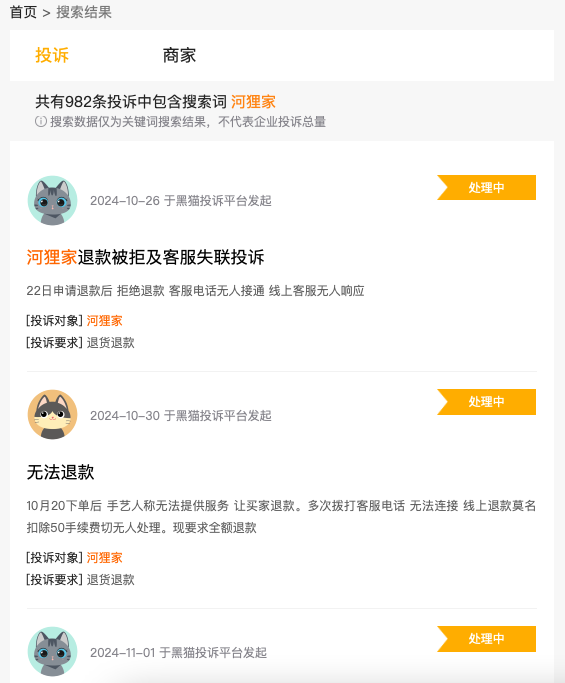 黑猫投诉显示,河狸家有多达982条投诉,大多数为消费者称无法退款。主要集中于拒绝服务、拒绝退款;未消费订单申请退款却迟迟未退;约不到手艺人;参与充值送现金活动无法退款等。