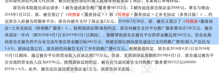 最终法院以河狸家承诺的半年营业额与合同约定的标准相距甚远等理由,判决河狸家退还重庆爱思特55.44万元推广服务费及2万元保证金。