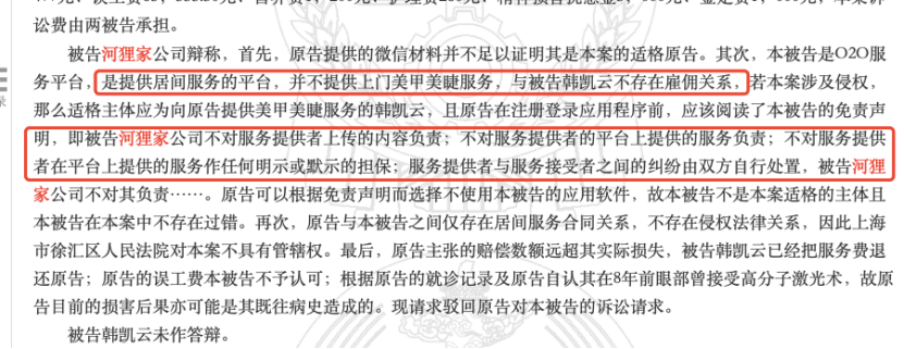 河狸家仍以其为提供居间服务的平台,与韩某不存在雇佣关系、且郭某在注册河狸家APP时,免责声明中已提出河狸家不对服务提供者提供的服务负责,消费者和服务者双方之间的纠纷自行处置等为由,拒绝对郭某进行赔偿。