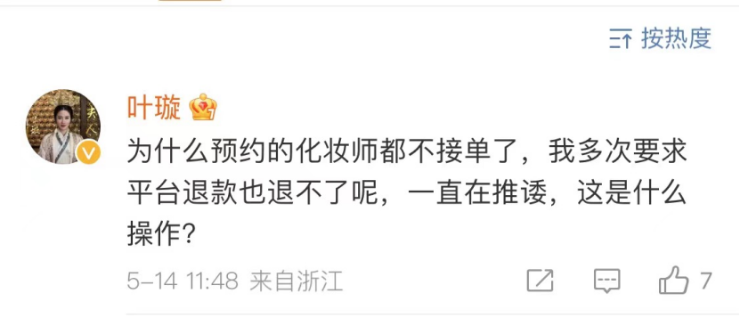知名艺人叶璇也在微博上发声,“为什么预约的化妆师都不接单了,多次要求平台退款也退不了呢,一直在推诿……”