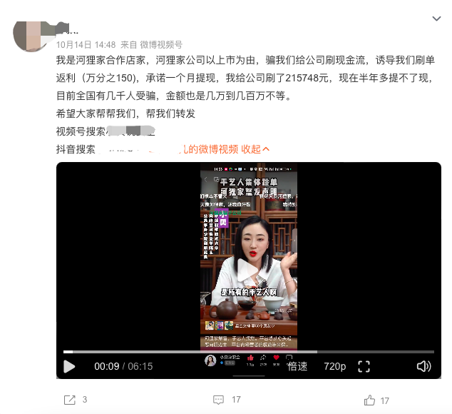 此次风波也波及部分商家。“河狸家公司以上市为由,骗我们给公司刷现金流,诱导我们刷单返利(万分之150),承诺一个月提现,我给公司刷了215748元,现在不单是利息不给了,本金也不给我们了。”