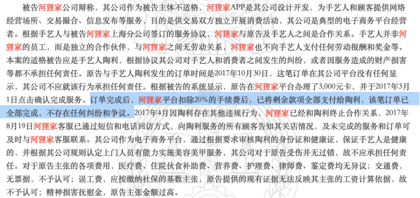 据一则相关裁判文书显示,河狸家平台上的一笔订单完成后,平台扣除20%手续费,剩余款项支付给手艺人。