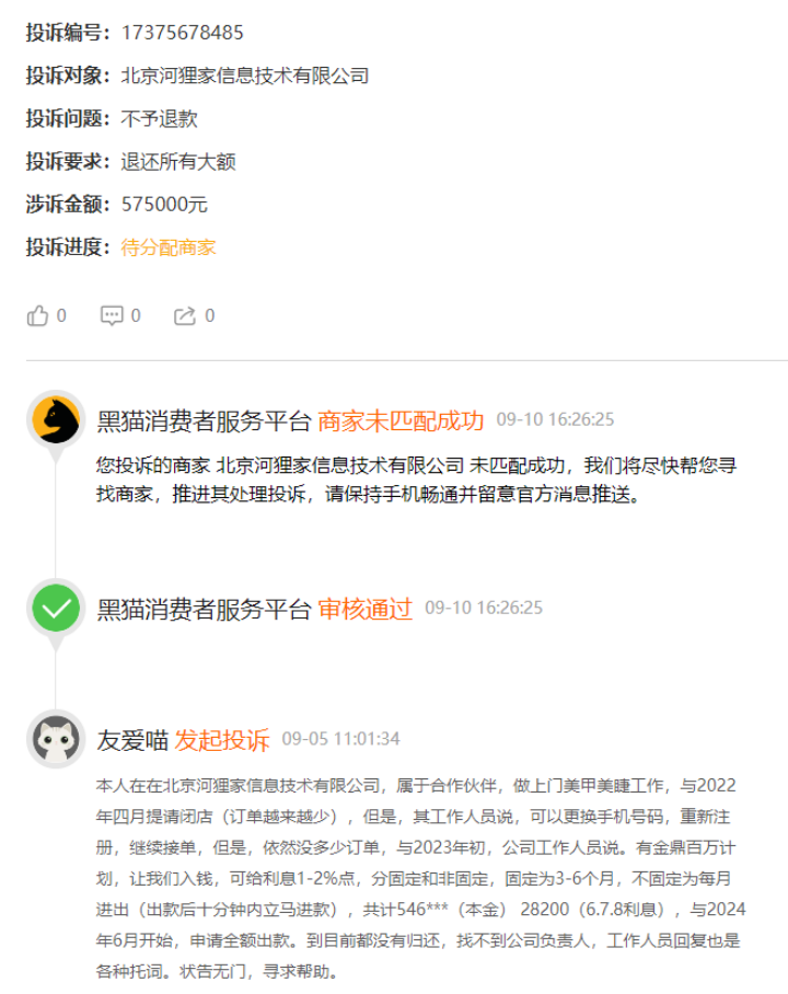 但在实际运营中,流量激励渐渐变了味。据黑猫投诉上一位手艺人称,其在河狸家做上门美甲美睫工作,因订单量减少,在2022年4月申请闭店。但是河狸家工作人员表示“(公司)有金鼎百万计划,投资可给利息1-2%,分固定和非固定,固定为3-6个月,不固定为每月进出”。
