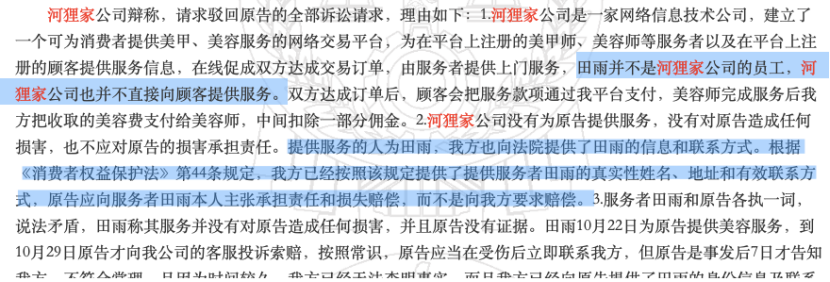 裁判文书网显示,2016年,河狸家的一位消费者李某,将河狸家和手艺人田某告上了法庭。原因是李某通过河狸家预约田某为其进行美容服务时,美容液流到李某眼内导致其眼部受伤。