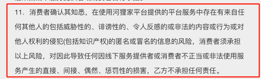 河狸家APP的《用户协议》显示,消费者在享受平台服务时,若出现任何线下服务提供者或消费者不正当或非法使用服务产生的直接、间接、偶然、惩罚性的损害,河狸家不承担任何责任。