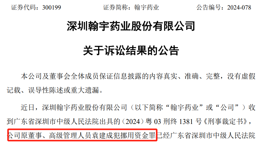 直到今年7月3日晚间,翰宇药业公告称,深圳市南山区人民法院再次做出判决:被告人袁建成犯挪用资金罪,判处有期徒刑三年六个月。