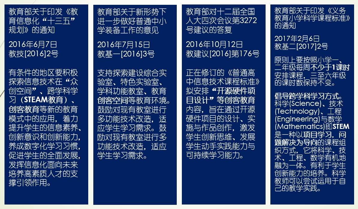 最近一年教育部在各项文件中以及目前积极推进的各类课程课标修订工作中都强调了对创客教育的重视和引导: