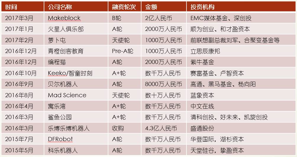 各类机构都在从不同的角度切入市场。从扶植地区明星企业的角度:深圳创新投资集团在B轮投资了MakeBlock这家在创客领域植根深圳的公司;从拓展教育领域发挥原有资源优势的角度:A股上市公司盛通股份依托自身出版行业的资源积极布局教育领域,4.3亿元收购创客教育线下培训机构乐博乐博机器人;另一家上市公司立思辰,旗下专注智慧校园的全资子公司康邦科技,在Pre-A阶段投资了青橙创客教育。从布局创客教育细分市场的角度:教育行业巨头新东方在A轮投资了乐博乐博机器人和寓乐湾;好未来在A+轮投资了鲨鱼公园。从加强技术领域合作的角度:芯片巨头高通(Qualcomm Ventures)在A轮投资了贝尔机器人,电子投资领域的华登国际在A轮投资了DFRobot智位机器人。