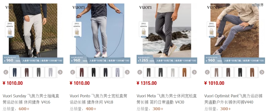打开天猫旗舰店,Vuori产品在中国市场的大致定价在400至4000元不等,主打产品男士运动长裤价格大多在800至1300元左右,以千元价格线为主,与lululemon正在布局的男装价格线相近。