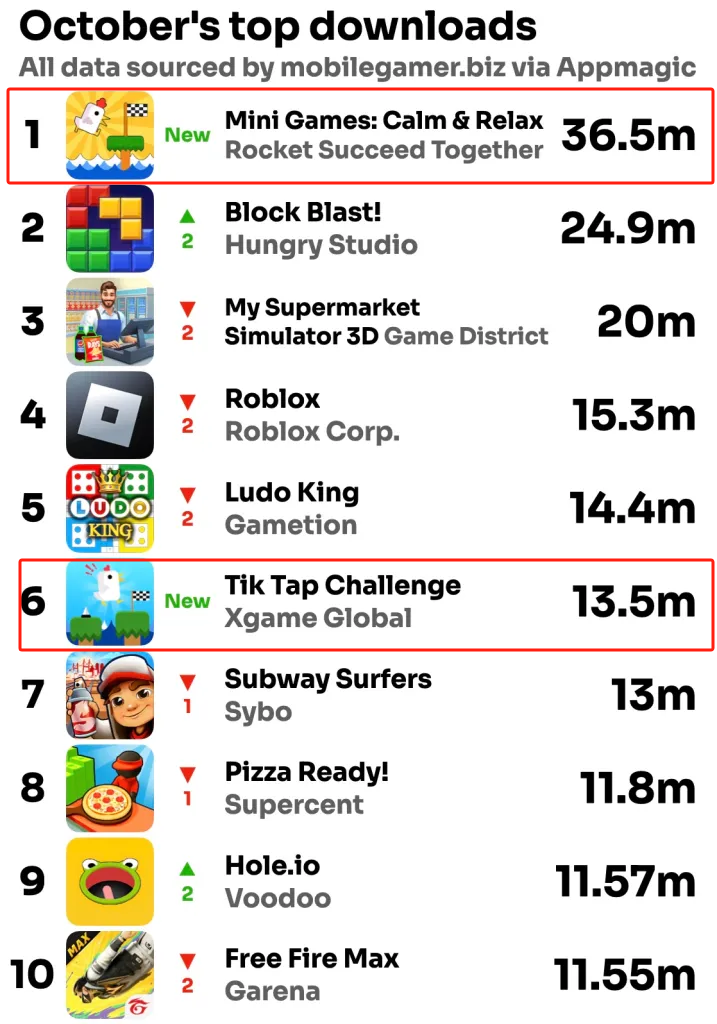 这两款游戏虽然都是首次登榜TOP10,表现却非常惊人,其中《Mini Games: Calm &Relax》以月增3600万次下载的突出成绩,直接空降下载榜首。而10月21日才上线的《Tik Tap Challenge》,更是在不到两周的时间里,就拿下了1350万次下载,并直冲榜单第6。