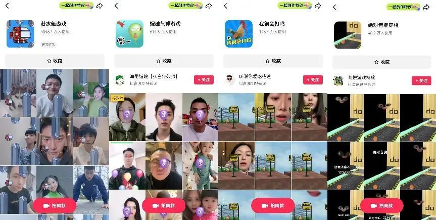 从抖音站内数据来看,明星云集的“潜水艇游戏”特效有超过4000万人次使用,“爆破气球”特效有500多万人玩过,和尖叫鸡类似的“我很会打鸣”使用人数超174万,“绝对音准”也有超48万人玩过。