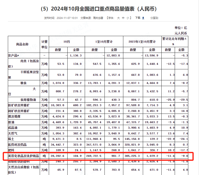 反观由海关总署公布的2024年10月全国进口重点商品量值表中,美容化妆品及洗护用品1-10月累计981.7亿元人民币,进口金额累计比去年同期下滑9.0%。