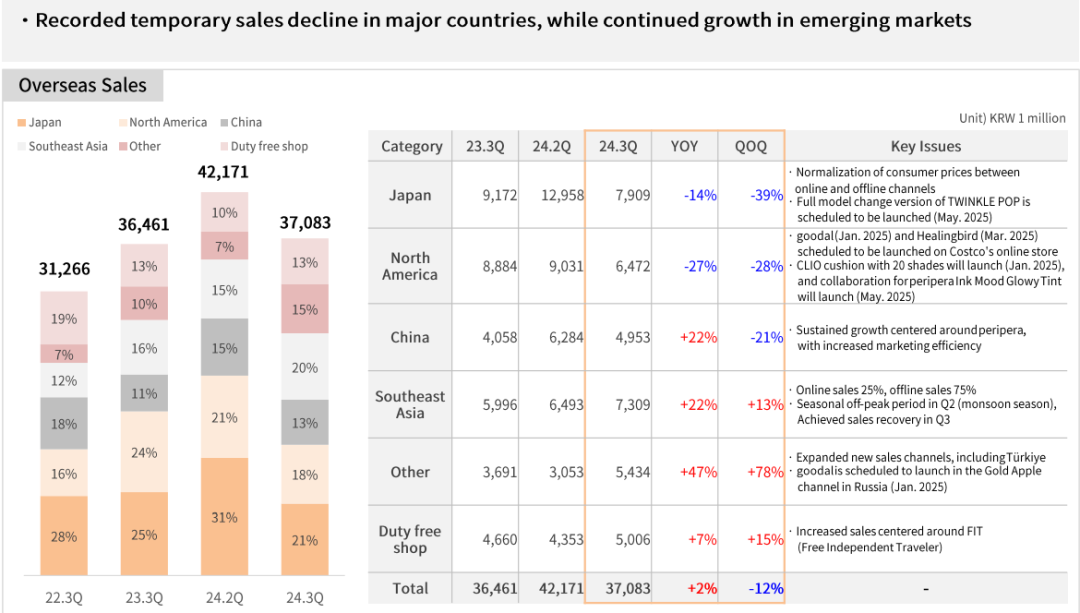 如上文所说,在各大韩妆企业公布的三季报中,同样也表达了对北美、日本市场的关注。
