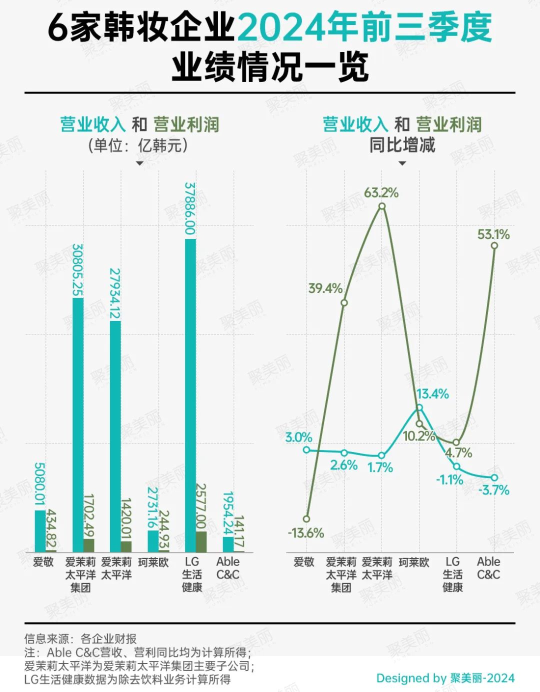 根据目前LG生活健康、爱茉莉太平洋、爱茉莉太平洋集团、爱敬、珂莱欧、Able C&C 这六家韩国化妆品公司发布的财报情况来看,第三季度营业收入、营业利润同比下滑的各有3家。
