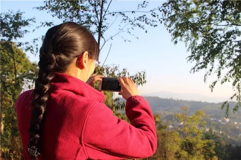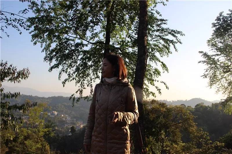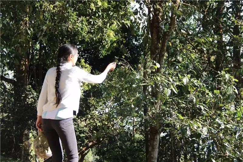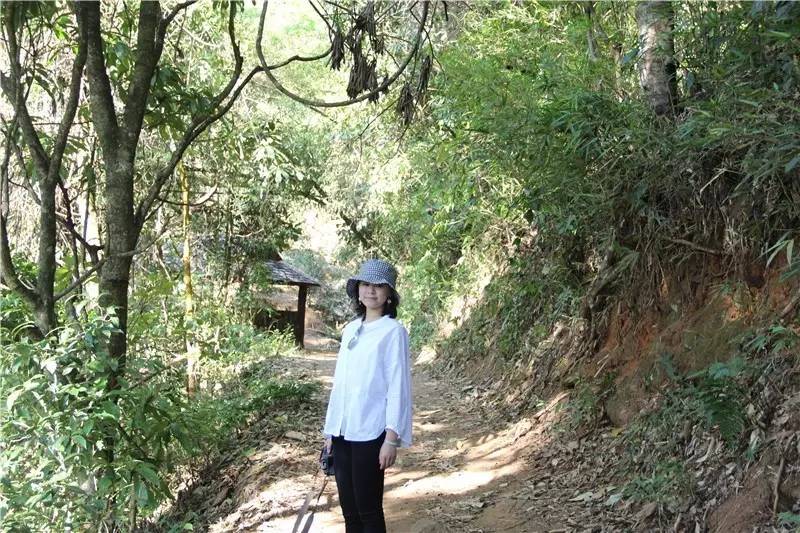五人欢笑着往上走,脚下是松软的紫红色的细沙路。走完细沙路,往下去,便是垂直并排连立的古茶树,树龄大约是四五百年的样子,将泥土路上的阳光遮挡部分,弯着腰行走在古茶树下,仿佛时光静止。