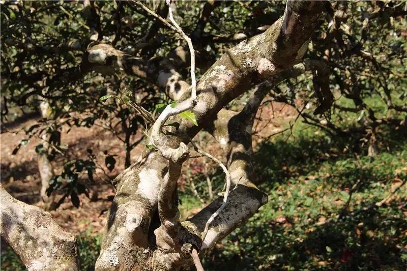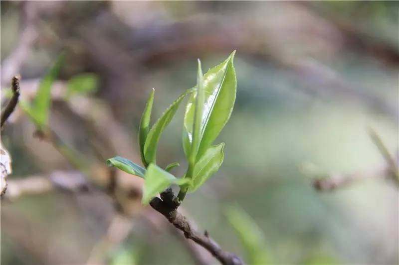 走过了上坡下坡,路旁突现四五棵没有老茶叶,树干粗壮、枝丫繁盛的茶树,树梢处都发出了翠绿鲜嫩的茶芽,有的茶芽只是一芽;有的已经长成一芽二叶;在众多老叶汇聚的茶林中,这几棵茶树突显新意。
