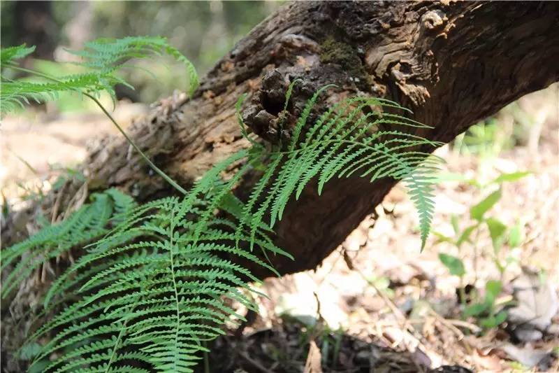 继续往前走,路的上方和下方都生长着一棵棵的茶树。有的茶树树干较细,笔直;有的茶树树干稍粗,枝丫往四面八方伸长;越往里走,路面上的落叶越厚。茶树周围没有杂草,但林立着许多粗壮高大的树木。春风过处,落叶纷纷,宛若绿色的精灵,在山间轻舞。茶树和其他树木和谐共生,绿意盎然。