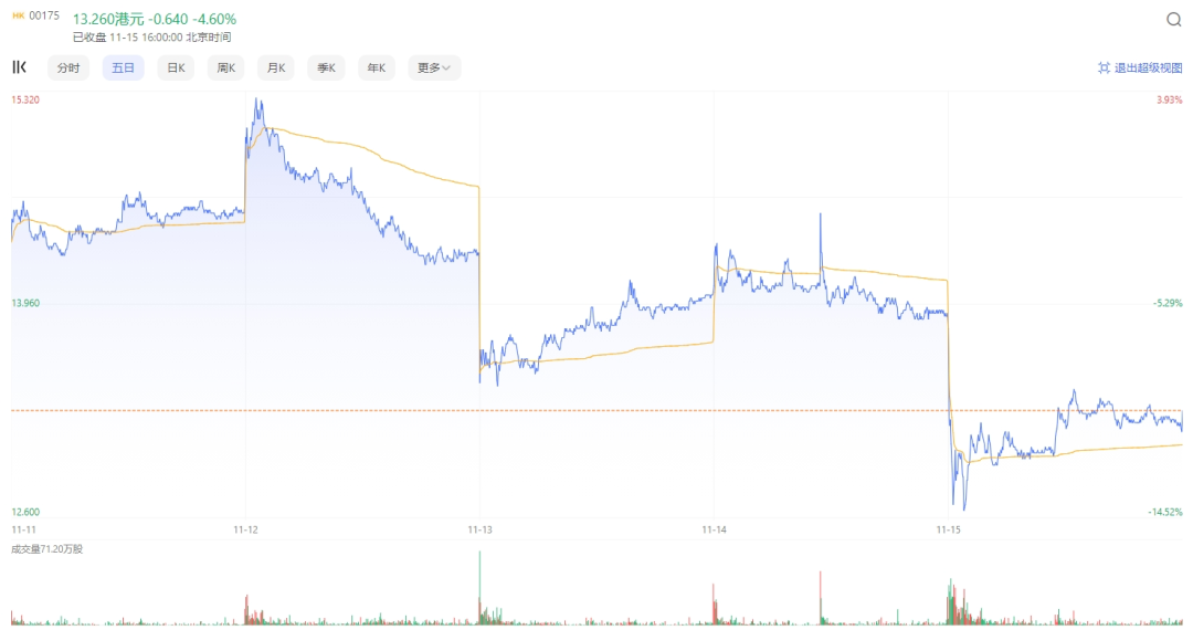 财报业绩尚佳之下,近日吉利汽车的股价却在下跌;11月15日当天,股价下跌4.6%,报收13.26港元/股,总市值为1327亿港元。