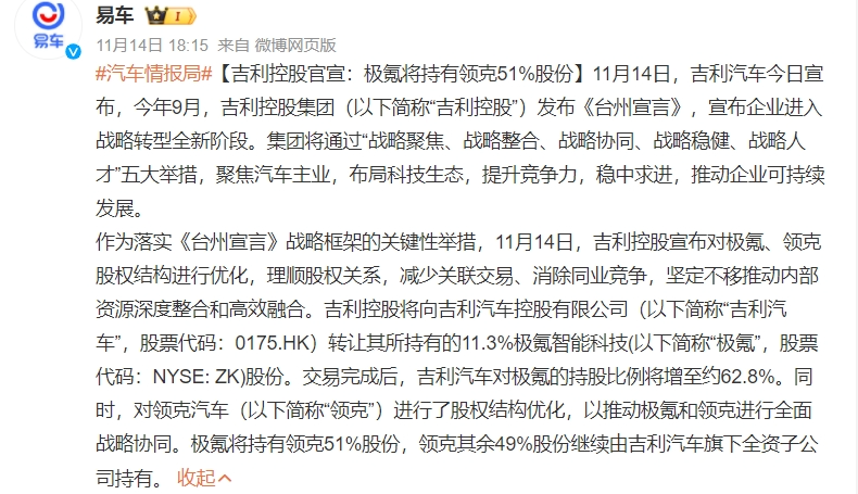 《台州宣言》之后,吉利立刻做出了行动。11 月 14 日,沃尔沃汽车宣布将把持有领克的 30% 股份出售给极氪,交易价格约为 54 亿元,预计明年一季度完成;同日,吉利控股宣布,极氪将持有领克 51% 股份,其余股份继续由吉利汽车旗下全资子公司持有。也就是说,极氪和领克合并了。