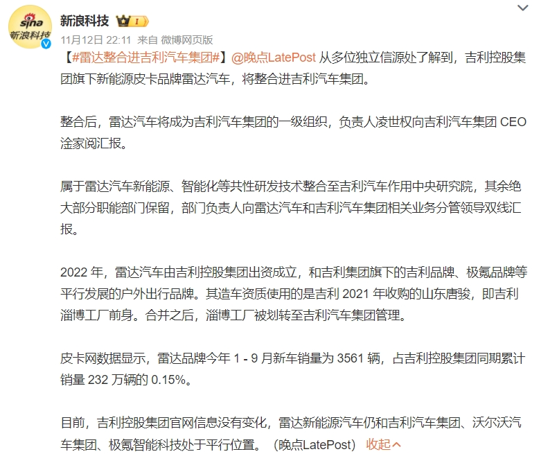 实际上,在极氪和领克合并之前,吉利就已经开始了“品牌整合大法”,此前,雷达汽车已经并入吉利汽车集团、几何也并入银河系列了......