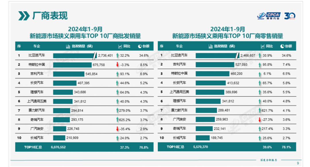 从乘联会数据来看,今年前三个季度,新能源乘用车零售销量前十名的厂商中,比亚迪为第一名,吉利则紧随其后。不过从市占率来看,吉利这个老二的市占率为7.4%,比起比亚迪的34.8%仍有较大的差距。