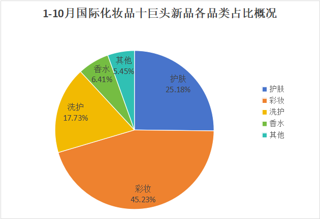 护肤品类跌幅最大,因而在今年1-10月注册备案的新品中,彩妆占据主导地位,占比高达45.23%;护肤品类位居第二,占比达25.18%。