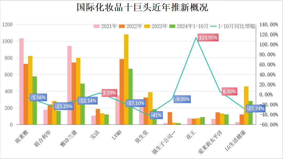 可见,2024年1-10月,全球化妆品十巨头中,除了宝洁、花王、爱茉莉太平洋推新实现增长外,其他集团的备案新品数都呈现出不同程度的下滑。