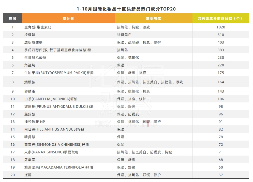 梳理1-10月全球化妆品十巨头备案的新品,不难发现,维生素类成分备受追捧。在热门功效成分TOP20榜单中,维生素类成分占据了三席,分别为生育酚(维生素E)以及烟酰胺(维生素B3)、泛醇(维生素原B5)。