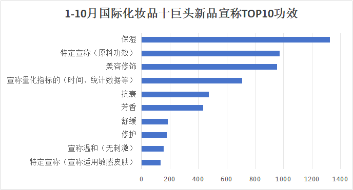 在产品功效宣称上,今年1-10月备案新品中,保湿、特定原料宣称、美容修饰、宣称量化指标、抗衰、芳香、舒缓、修护、温和无刺激、特定宣称(适用敏感肌)为TOP10宣称功效。