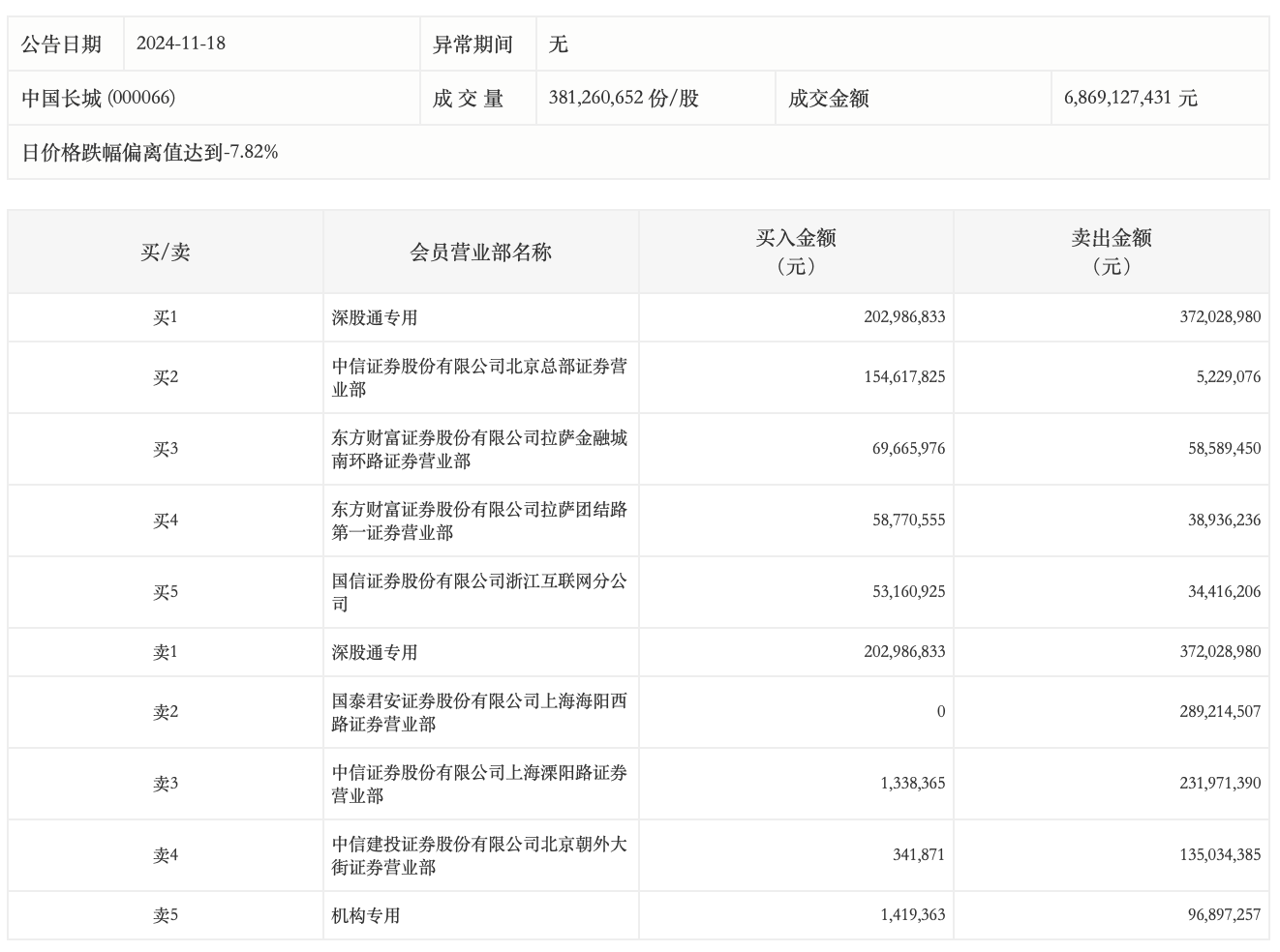 11月18日,中国长城今日跌停,成交额68.69亿元,换手率12.12%,盘后龙虎榜数据显示,深股通专用席位买入2.03亿元并卖出3.72亿元,中信证券北京总部净买入1.49亿元,一机构专用席位净卖出9547.79万元。