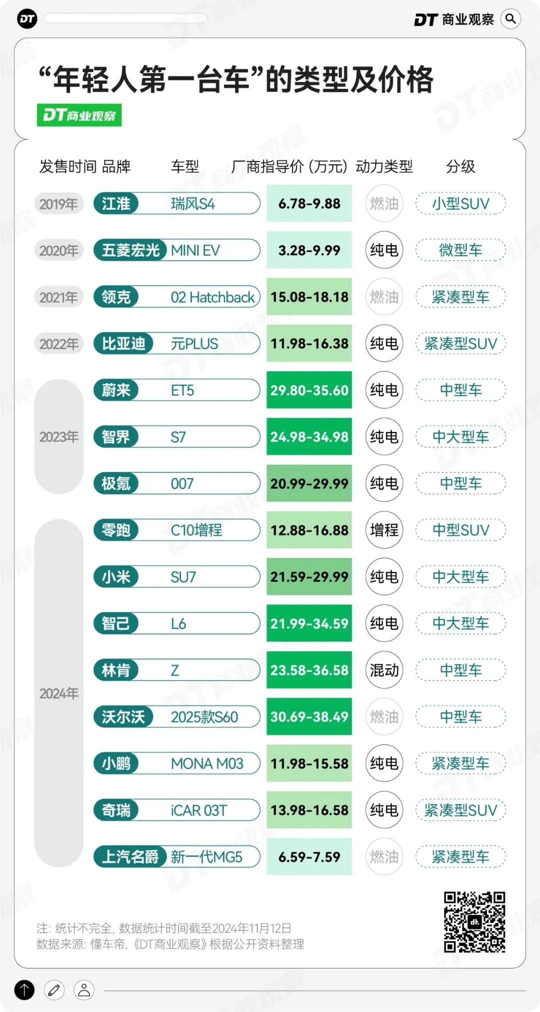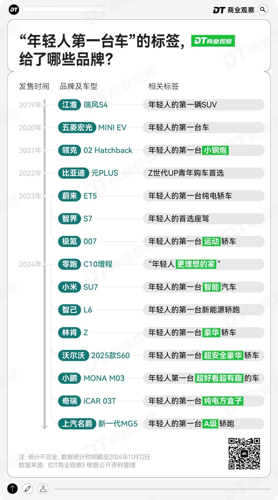 根据《DT商业观察》的不完全统计,由“年轻人第一台车”衍生出来的标签包括但不限于“年轻人的第一辆SUV”(瑞风S4)、“年轻人的第一台纯电轿车”(蔚来ET5)、“年轻人的第一台新能源轿跑”(智己L6)、“年轻人第一台A级轿跑”(上汽名爵新一代MG5)、“年轻人第一台超好看超有趣的车”(小鹏MONA M03)、“年轻人的第一台超安全豪华轿车”(沃尔沃2025款S60)……